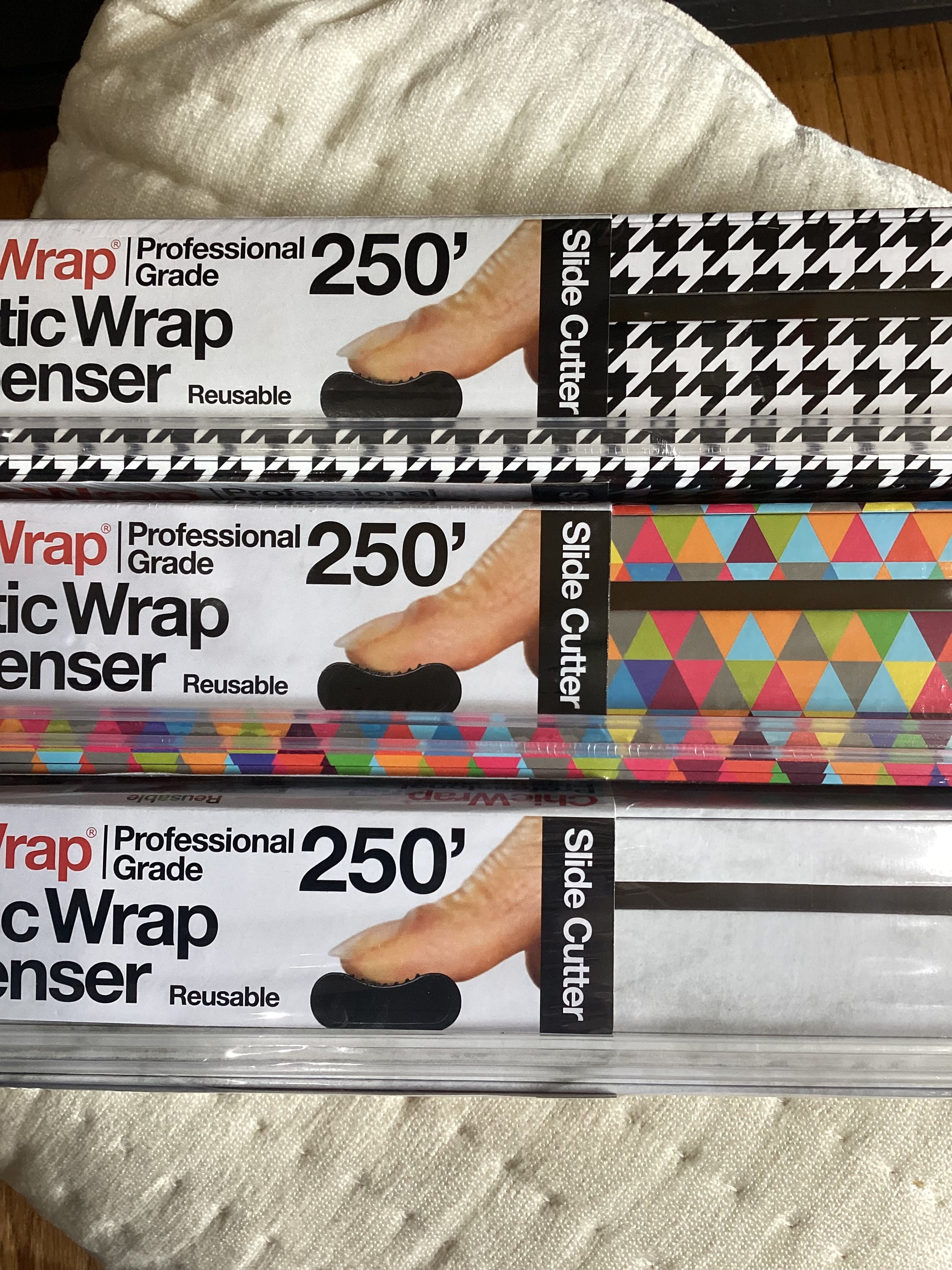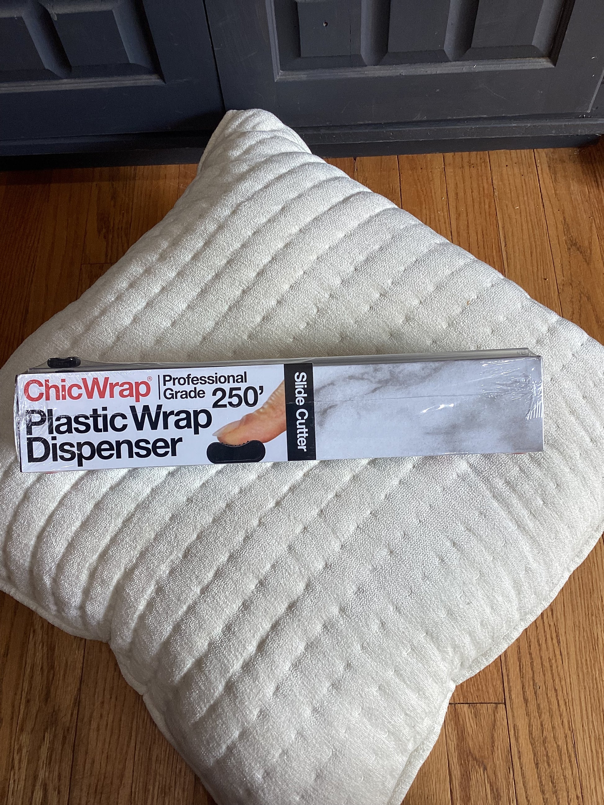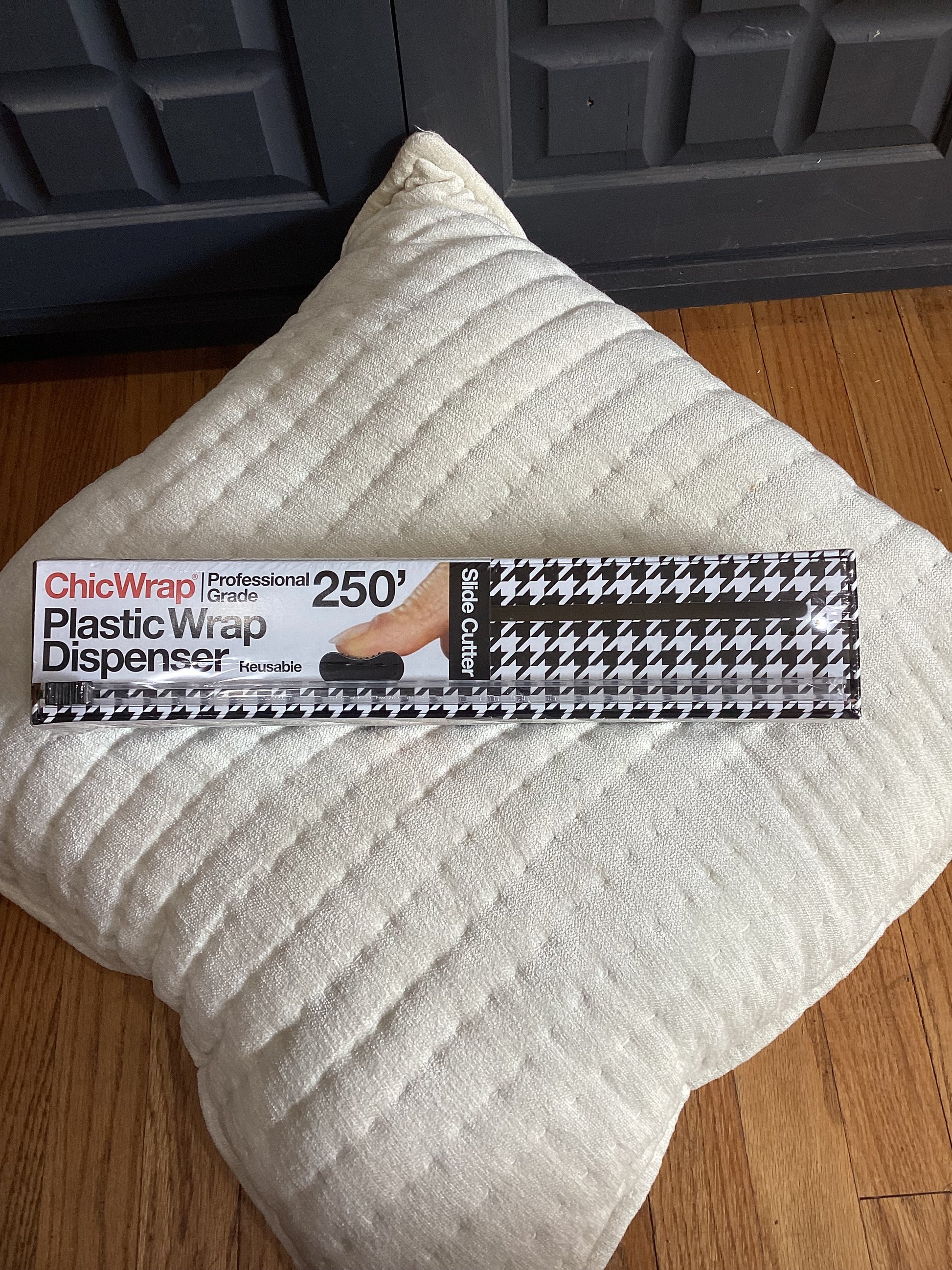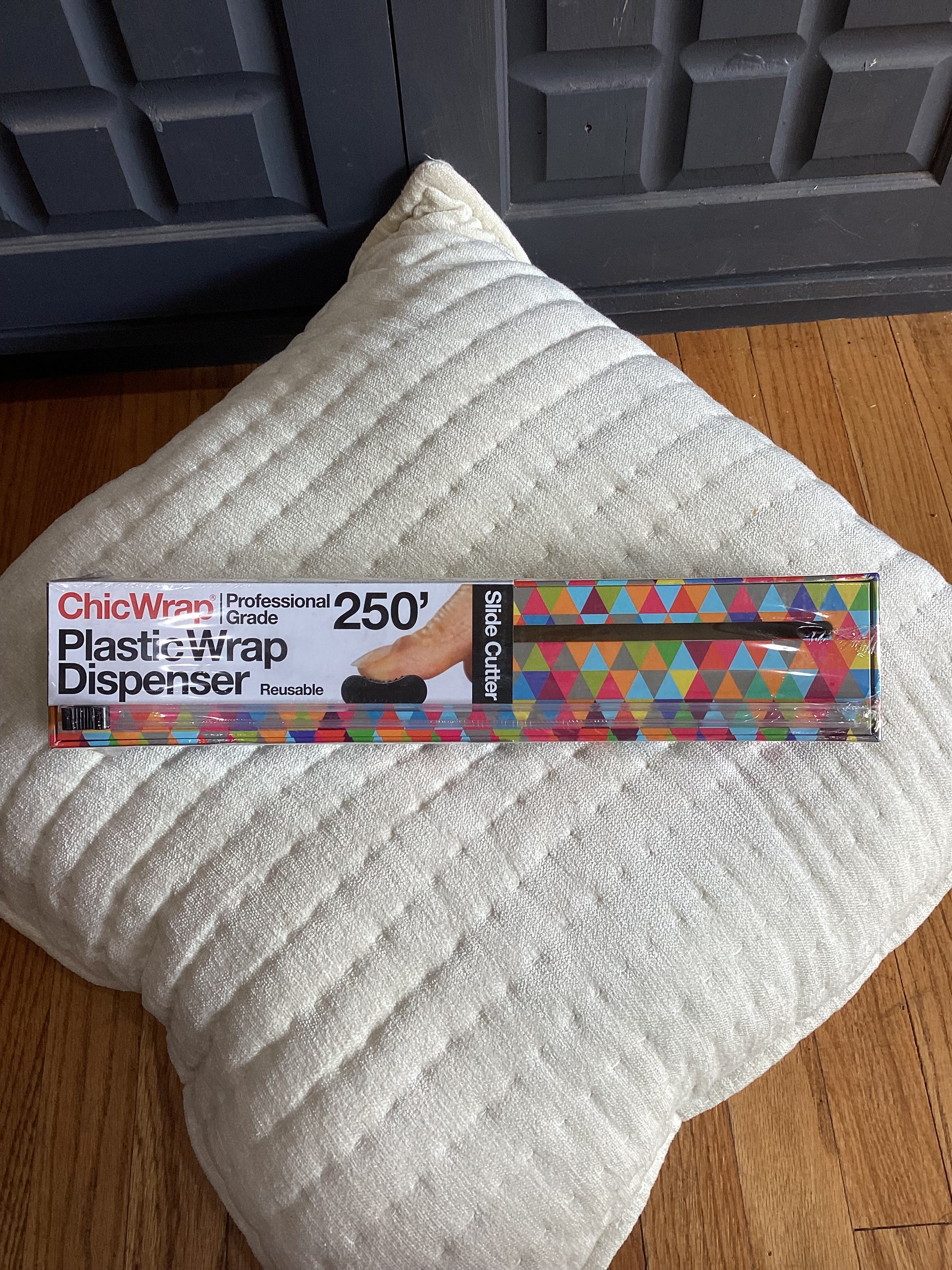 An easier way to use plastic wrap. Reusable and refillable. Pull to wrap and slide to cut. Comes with 250’ of plastic wrap.