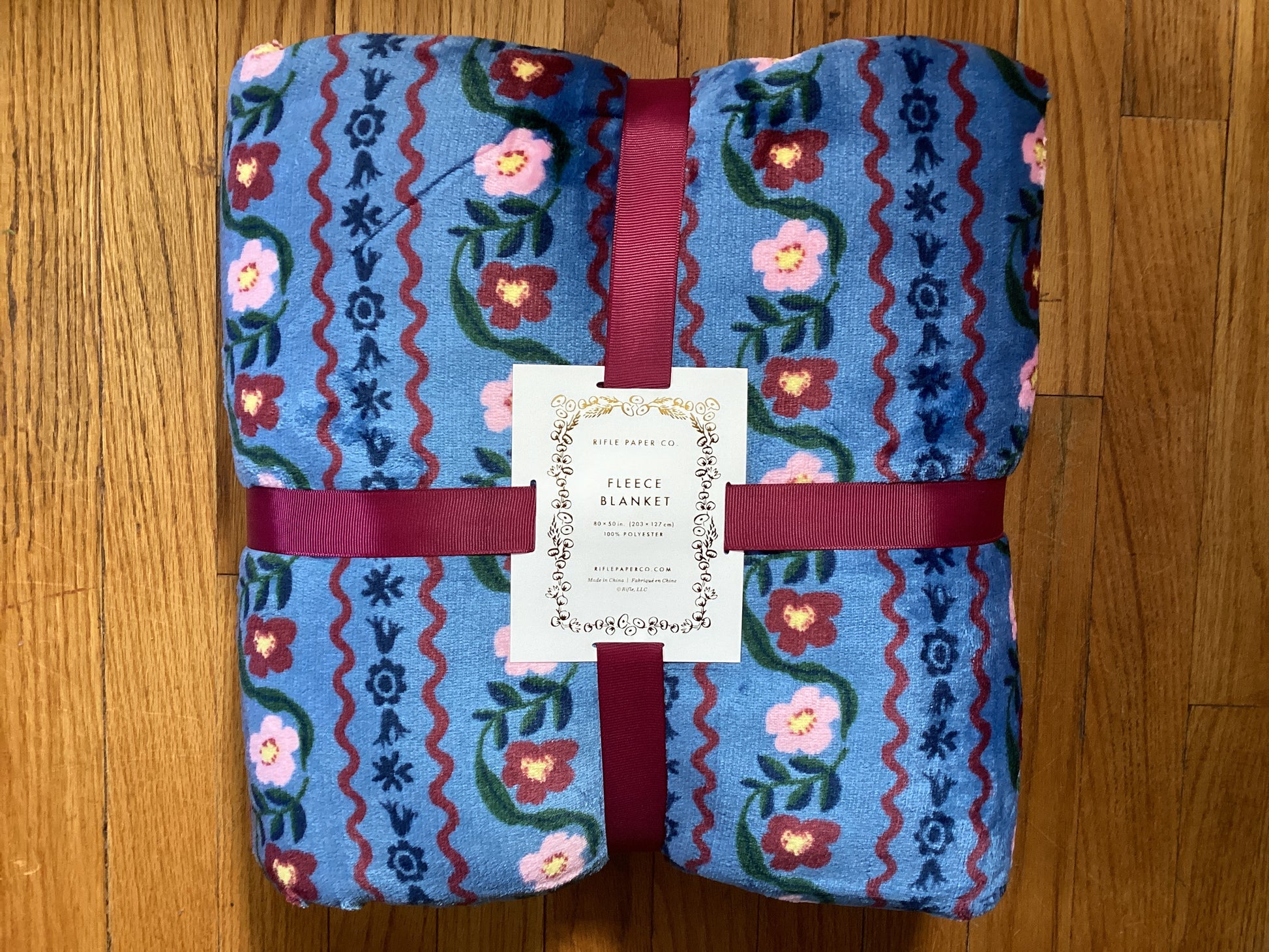 Cozy up in style with the Delphine Fleece Blanket, featuring Rifle Paper Co.’s signature hand-painted floral illustrations in a bold, all-over pattern. Made from ultra-soft 100% polyester fleece, this generously sized throw (approx. 80” × 50”) offers warmth and comfort while adding a vibrant decorative accent to your home. Reversible for versatile styling, it’s perfect for lounging on the sofa, layering on a bed, or gifting to someone special. Arrives neatly tied with a ribbon, making it ready for effortless giving.