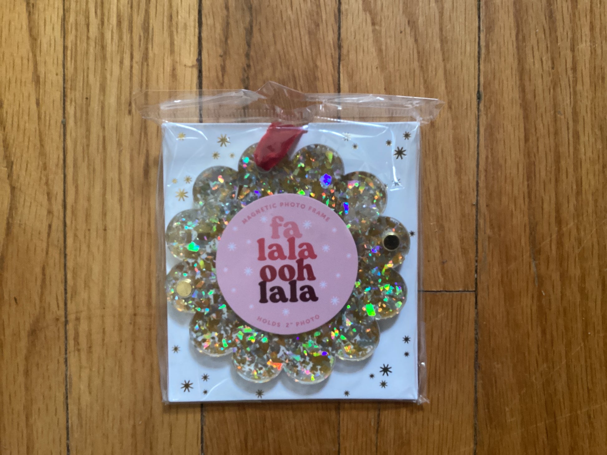 Shine bright this holiday season with the Gold Glitter Magnetic Photo Frame Ornament from The Darling Effect. Covered in gleaming gold glitter, this festive frame beautifully showcases a favorite photo while catching the warm glow of holiday lights. The magnetic backing lets it display proudly on refrigerators, lockers, or any metal surface, and the included ribbon makes it easy to hang on your Christmas tree. Perfect for gifting or cherishing your own special memories, it’s a radiant keepsake that adds a touch of glamour to any holiday décor.