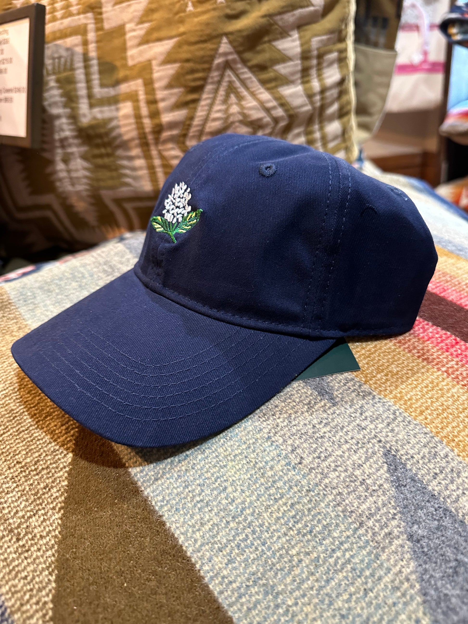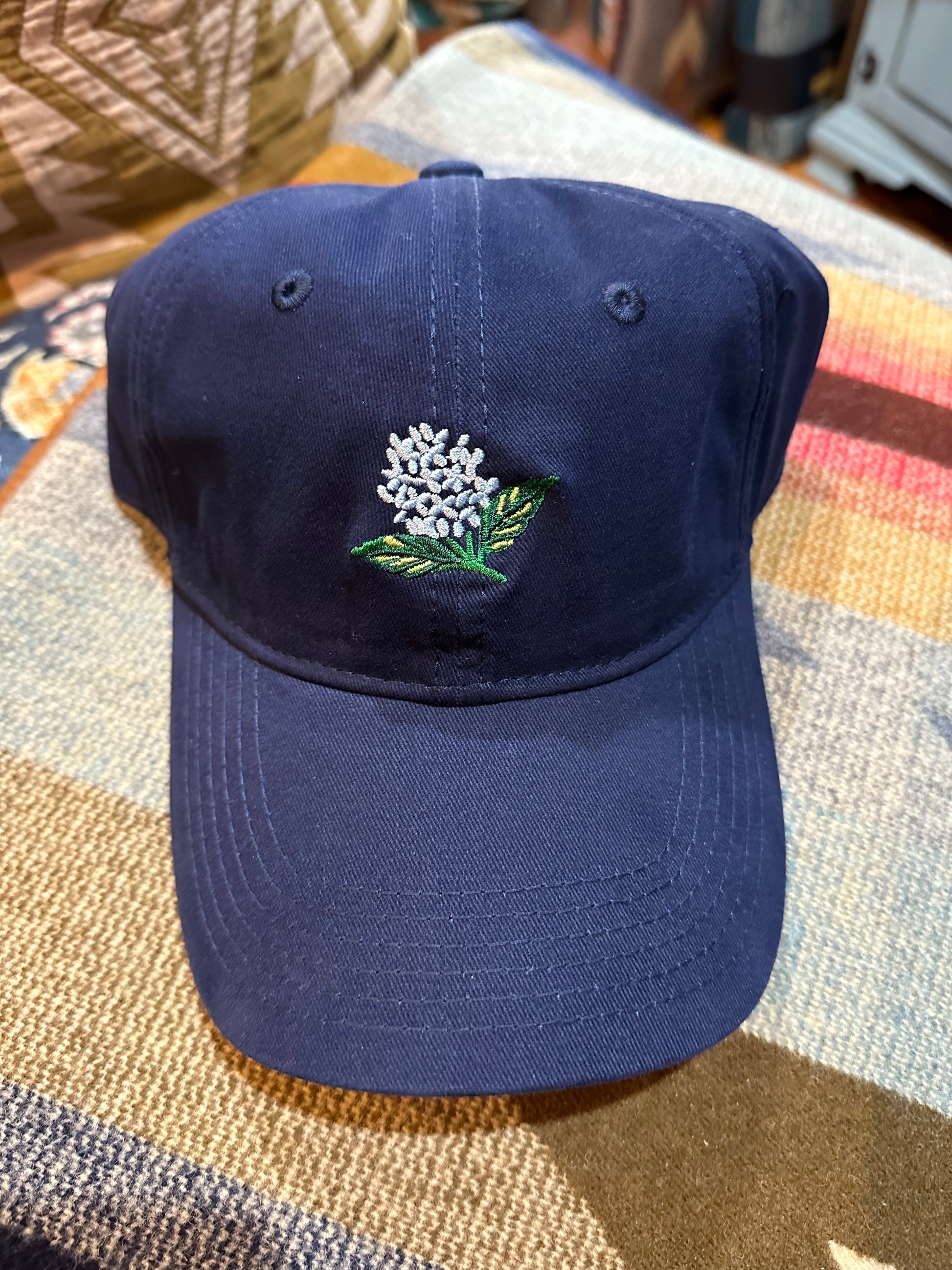 A classic six-panel baseball cap with an embroidered Hydrangea accent and adjustable strap for a perfect fit.