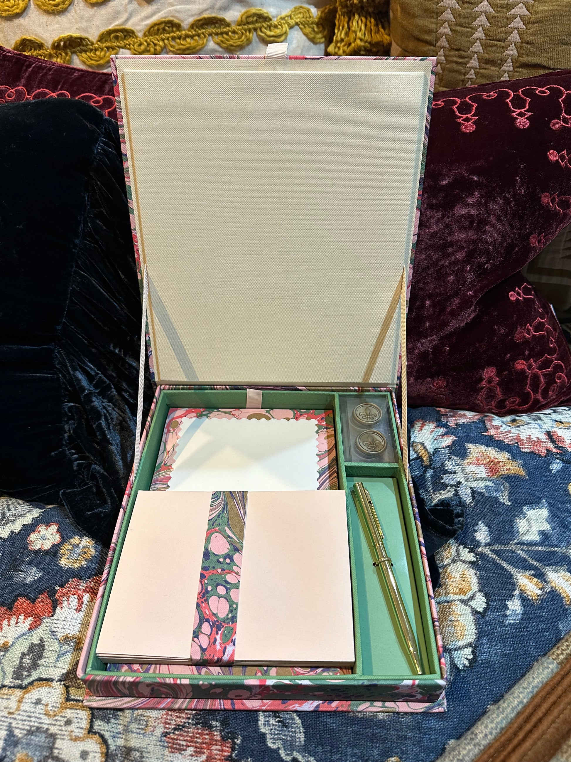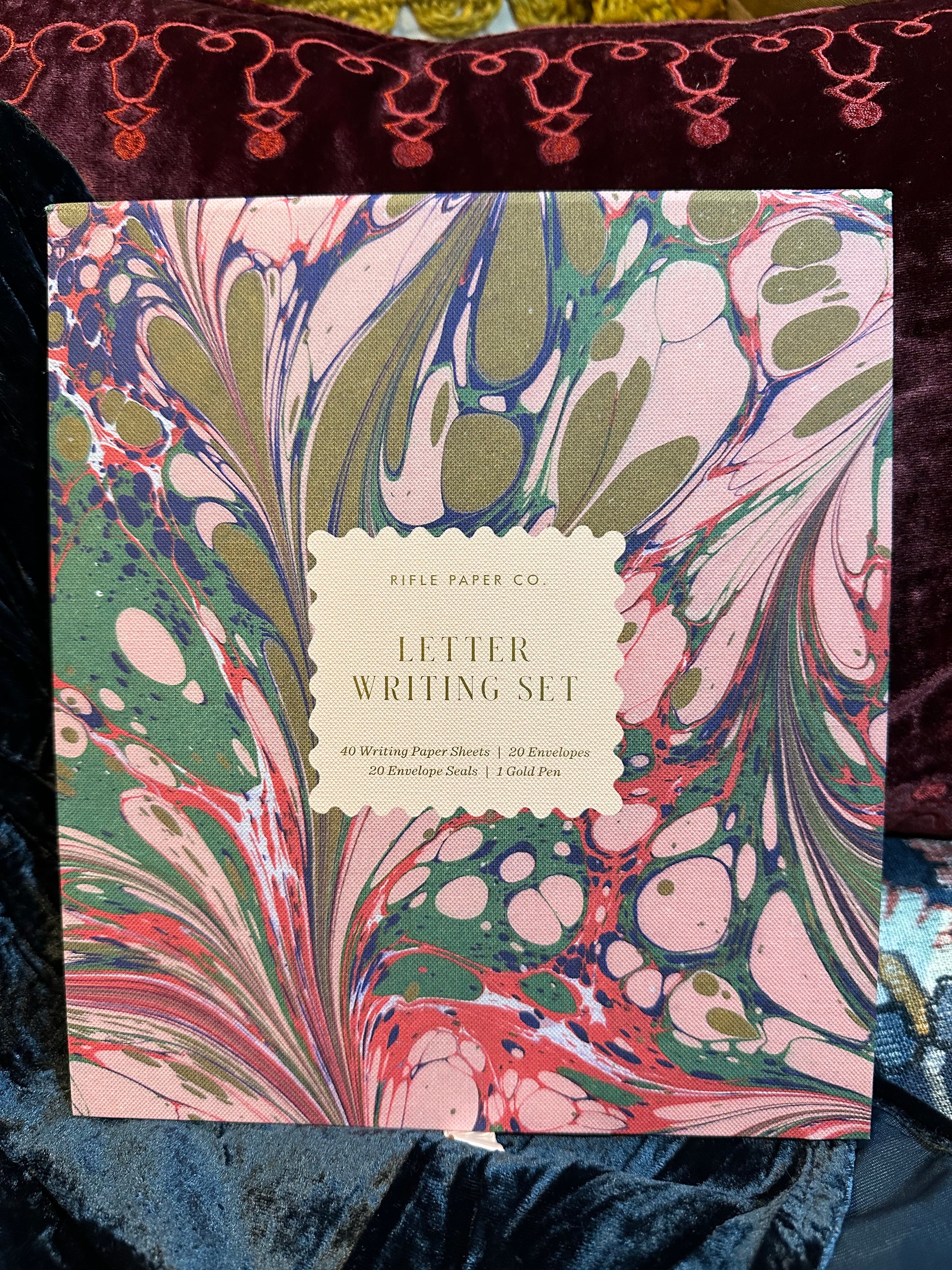 Practice the art of letter writing with our letter writing sets. Each beautifully boxed set includes 40 sheets of letter paper with illustrated designs, 20 coordinating envelopes, 20 gold envelope seals, and a pen.