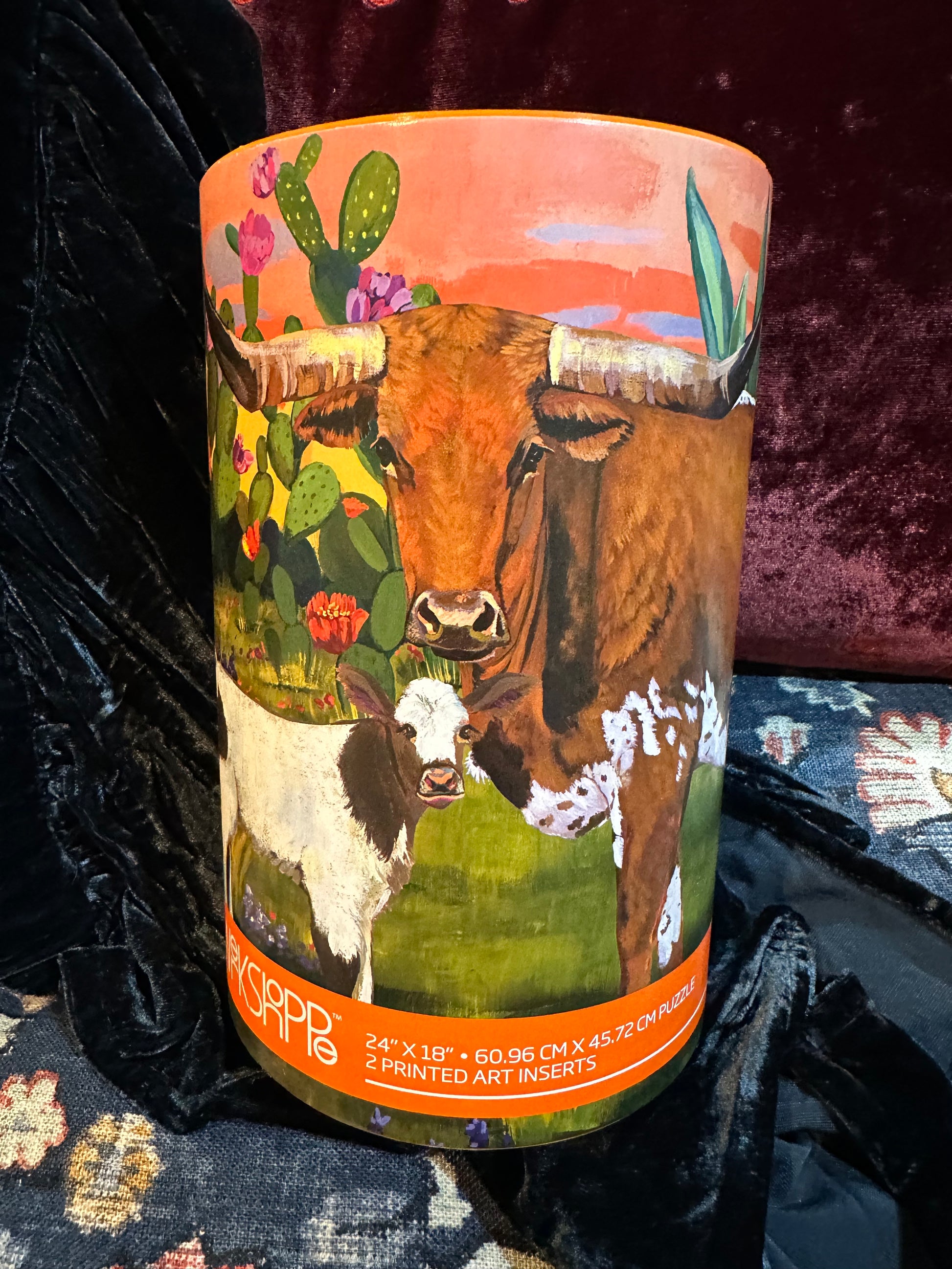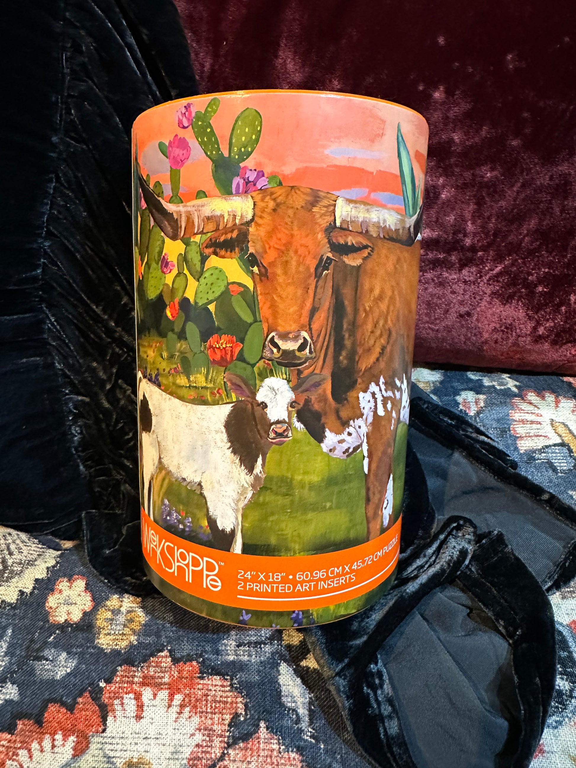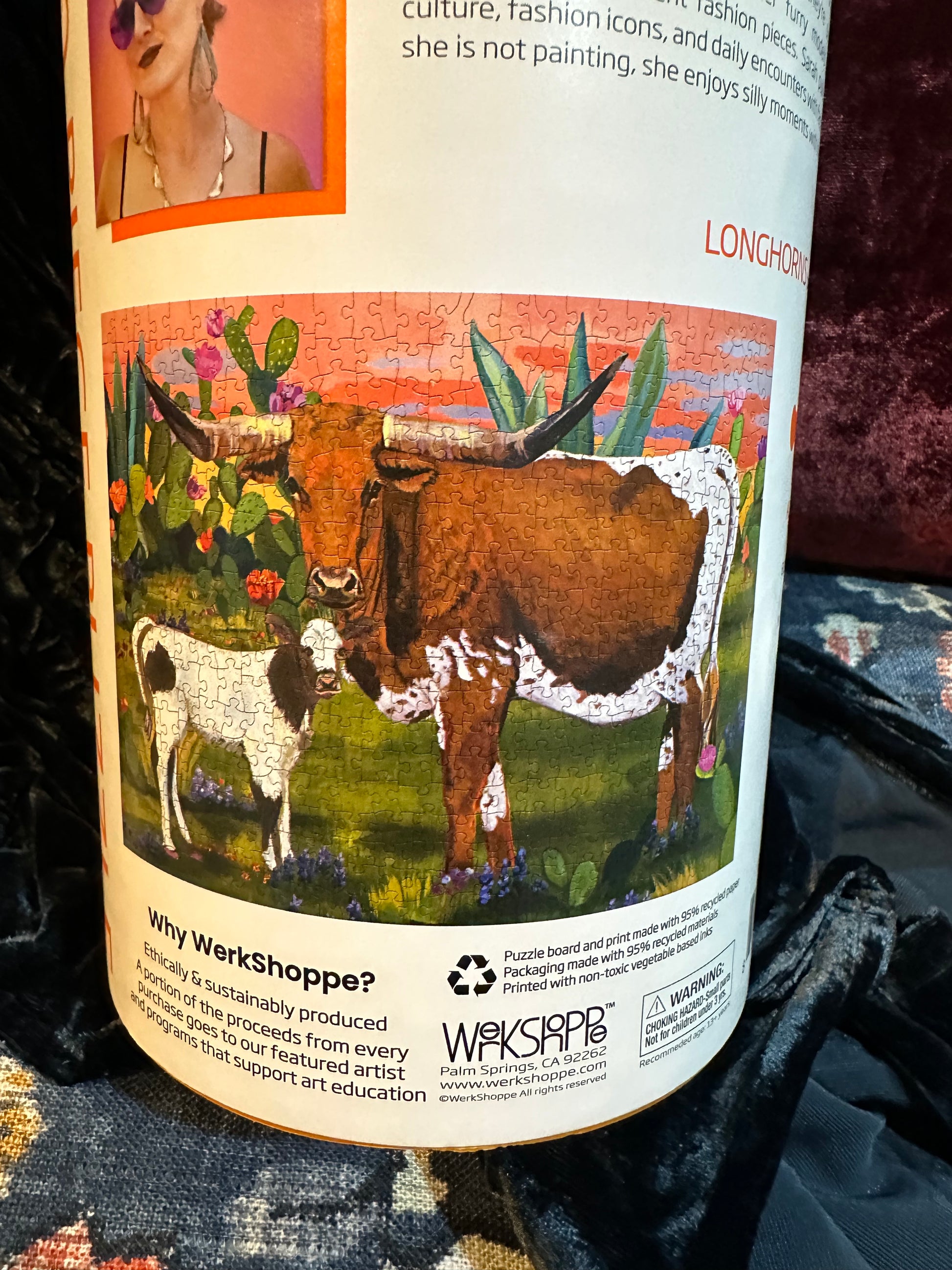 Experience the American longhorn in a natural prairie setting with this stunning 500-piece jigsaw puzzle. The silhouette of a longhorn cow and her tender calf is captured in colorful detail from the animals' calm gazes to the hazy layers of the rugged landscape.