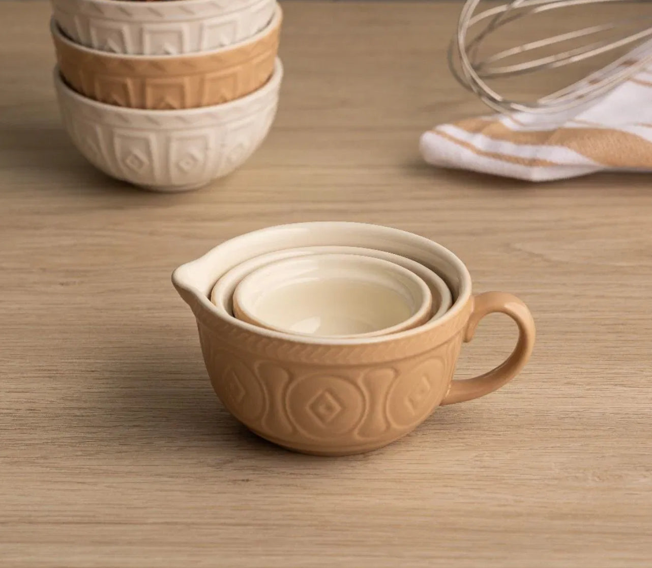 Add a bit of history and a bunch of practicality to your kitchen with the Mason Cash Cane Collection Measuring Cup Set. This set includes three various-sized measuring cups in Mason Cash's classic Cane design to let you navigate any baking task with ultimate precision and style. The classic Cane Collection's patterned exteriors and raised rims are easily gripped when holding and mixing — a design feature that has barely changed since it was introduced in 1901— and the warm natural color of the exteriors blend well with the variety of colors found in today’s kitchens. Durable enough for everyday food prep tasks, Mason Cash Cane Measuring Cups are made from chip-resistant earthenware that is safe for the dishwasher, freezer, and microwave. Pair with other pieces from Mason Cash's Cane Collection to complete your kitchen!