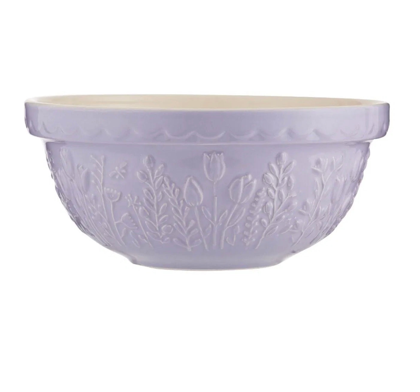 Bring the effortless charm of lush countryside fields indoors with the Mason Cash In The Meadow Collection S24 Mixing Bowl in Tulip. Made with Mason Cash's time-honored stoneware that is resistant to chipping and cracking, this mixing bowl will be a durably elegant addition to your everyday baking preparation. With a 2.15 Quart capacity, the S24 mixing bowl is ideal for preparing single batches of dough or batter or for serving side dishes. The light lavender purple coloring is highlighted with an embossed Tulip design that lines the bowl's perimeter, while the classic scalloped rim offers maximum grip - making for a practical, elegant piece that will let mixing tasks go smoother. Allow your baking tasks to bloom with style and order the Mason Cash In The Meadow Mixing Bowl today!