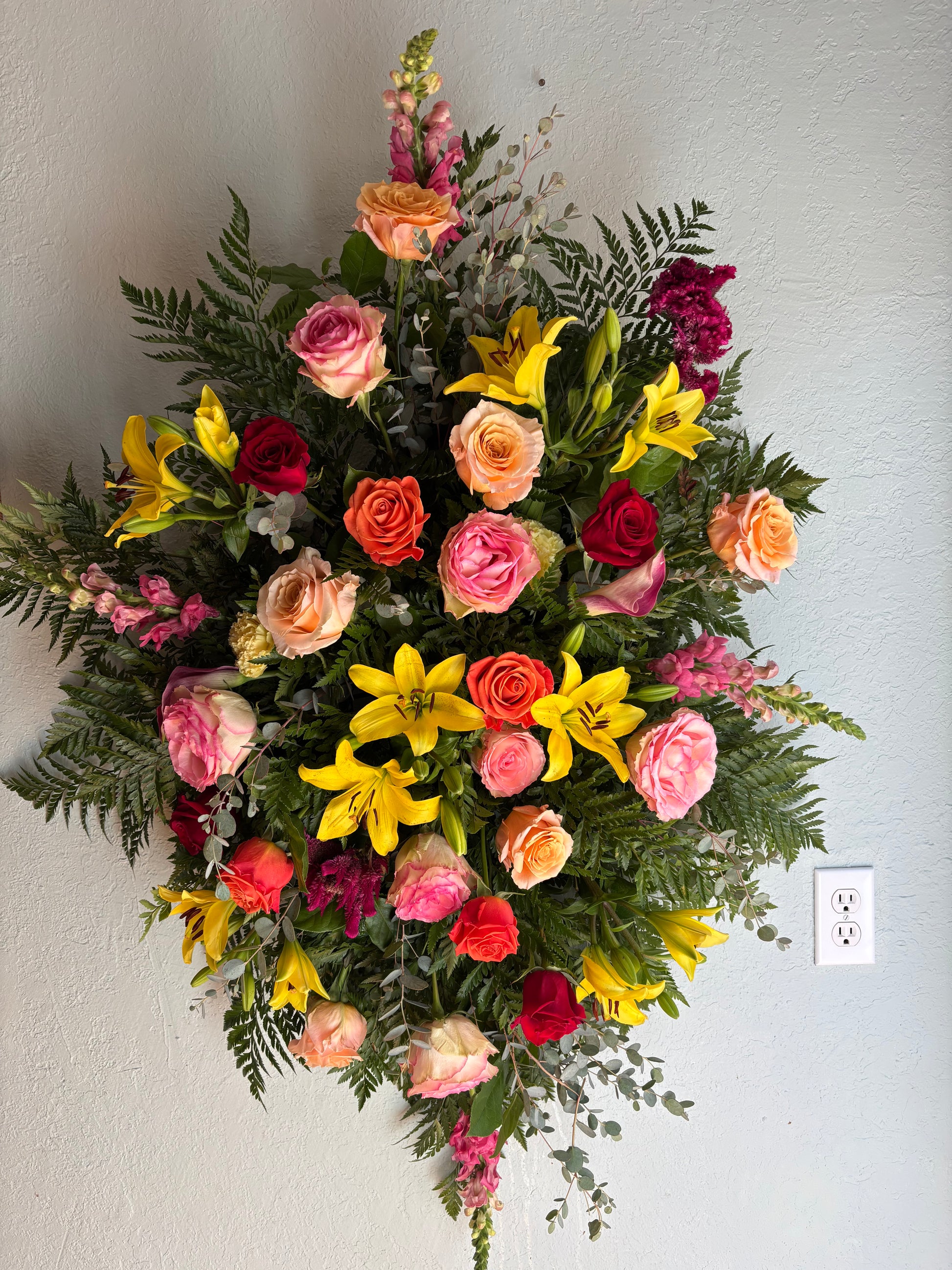 This one of a kind spray is a showcase of roses, line flowers, statement flowers, carnations, filler flowers and a variety of greenery. It can be customized with any color scheme available at the time, just let us know in the comments.