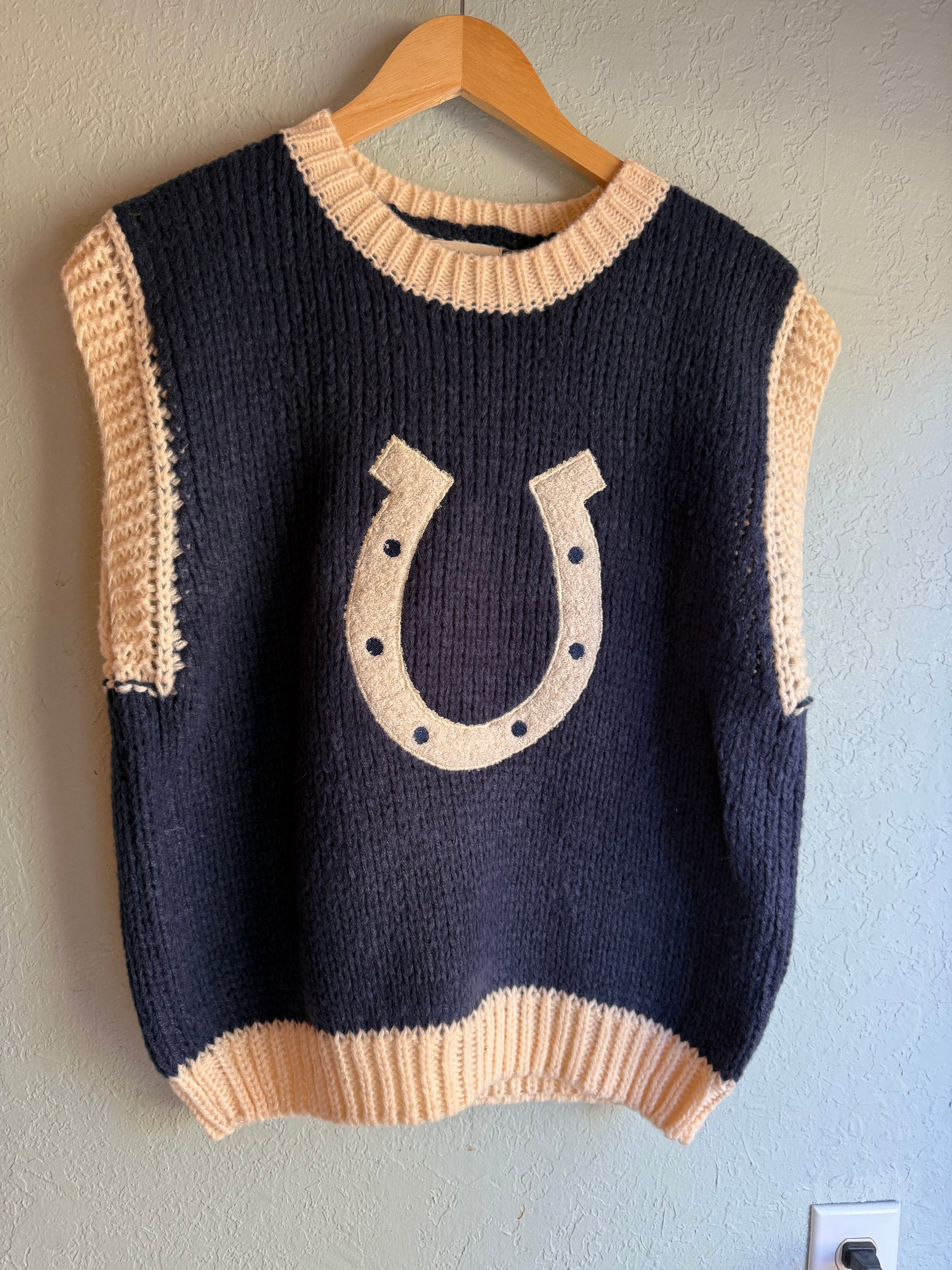 Embrace western charm with this cozy sweater vest featuring a distinctive horseshoe motif and classic ribbed trim detailing. Perfect for layering, this versatile piece combines traditional western elements with contemporary style.